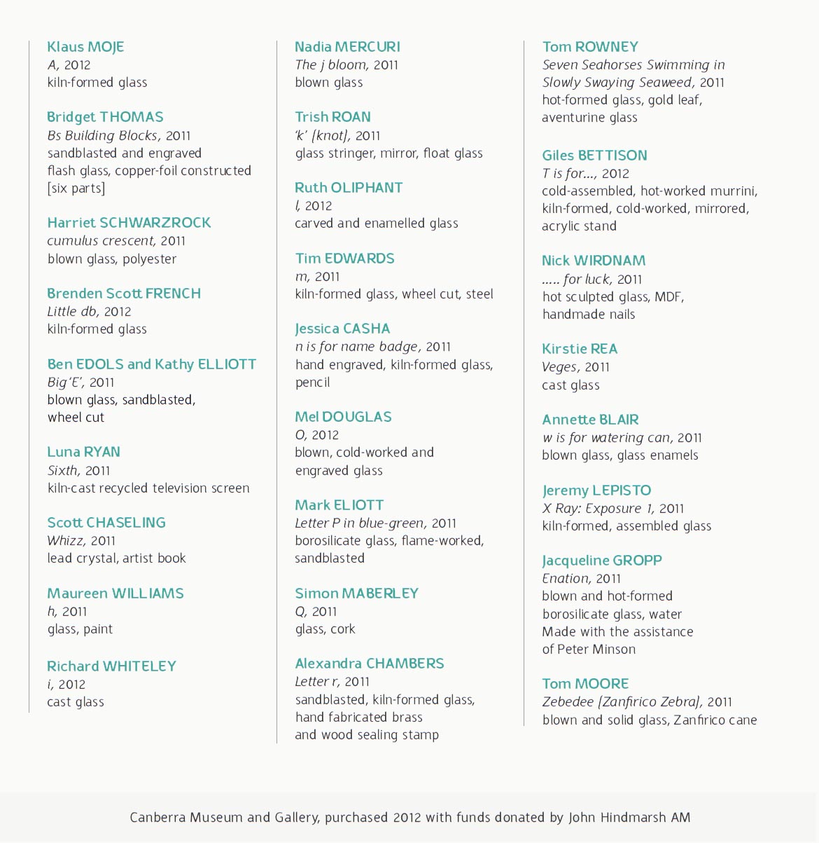 Canberra Museum and Gallery, purchased 2012 with funds donated by John Hindmarsh AM