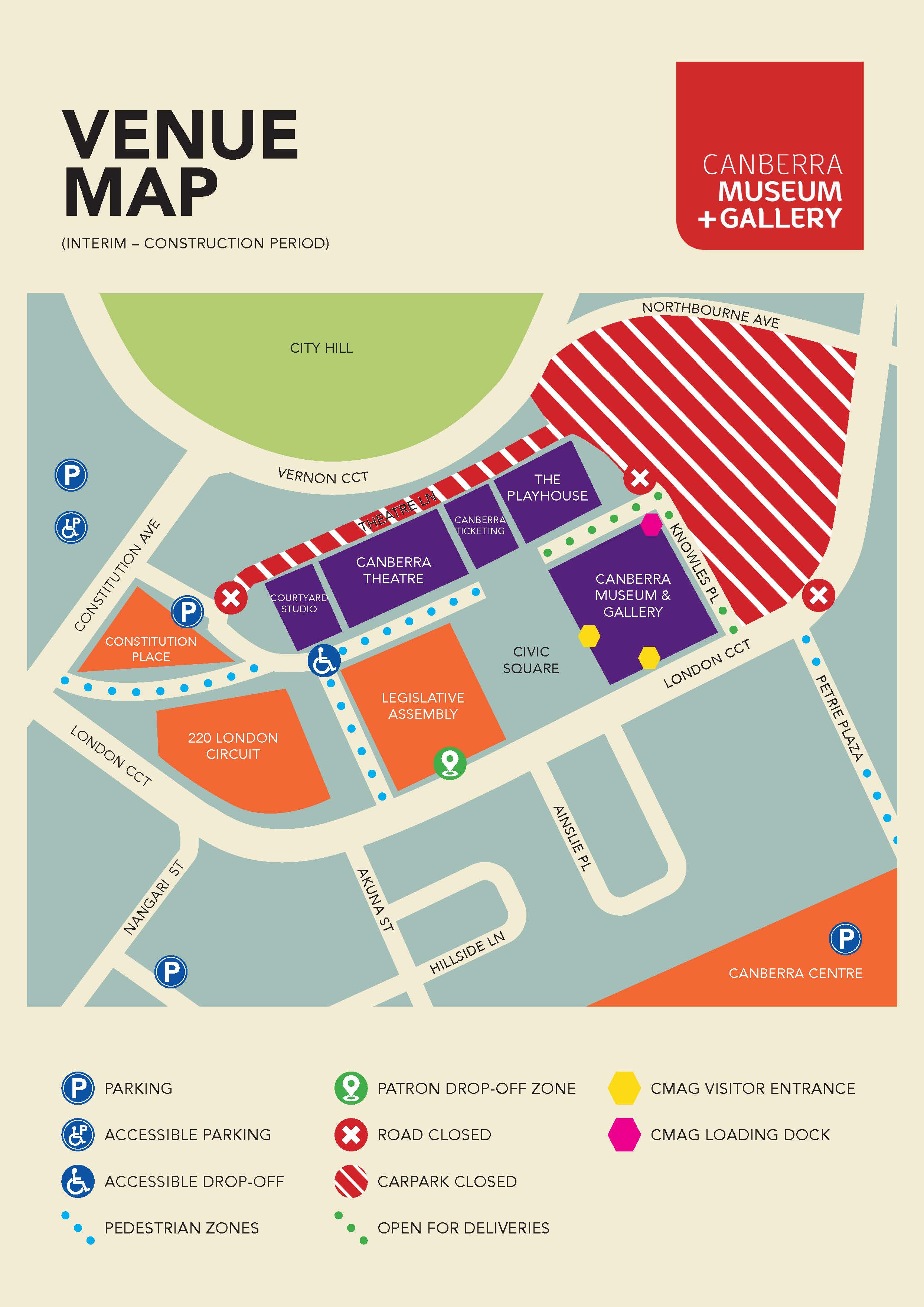 Construction has begun on the Light Rail to Woden project, including Raising London Circuit. We advise that you plan your visit with additional time to locate parking nearby, as there is reduced capacity and increased demand on available parking space near the Canberra Museum and Gallery.